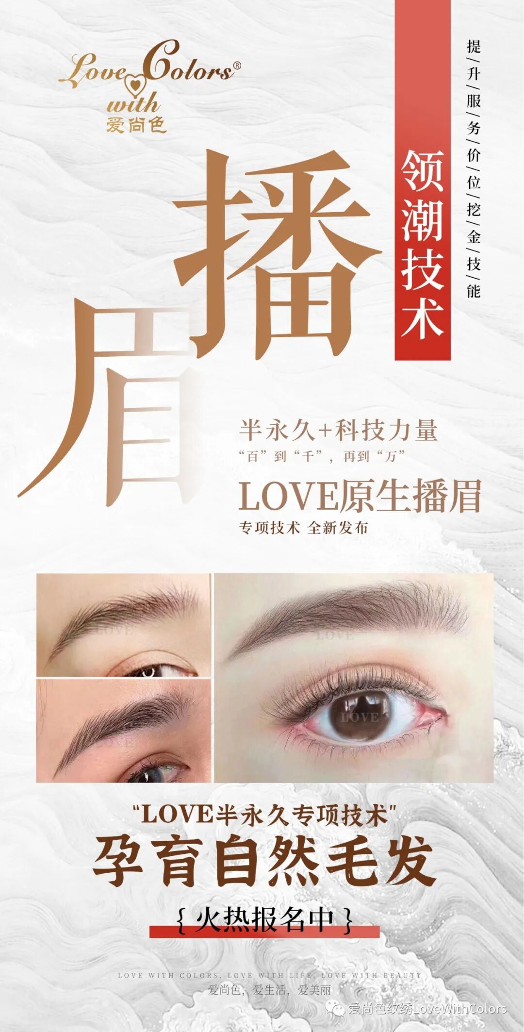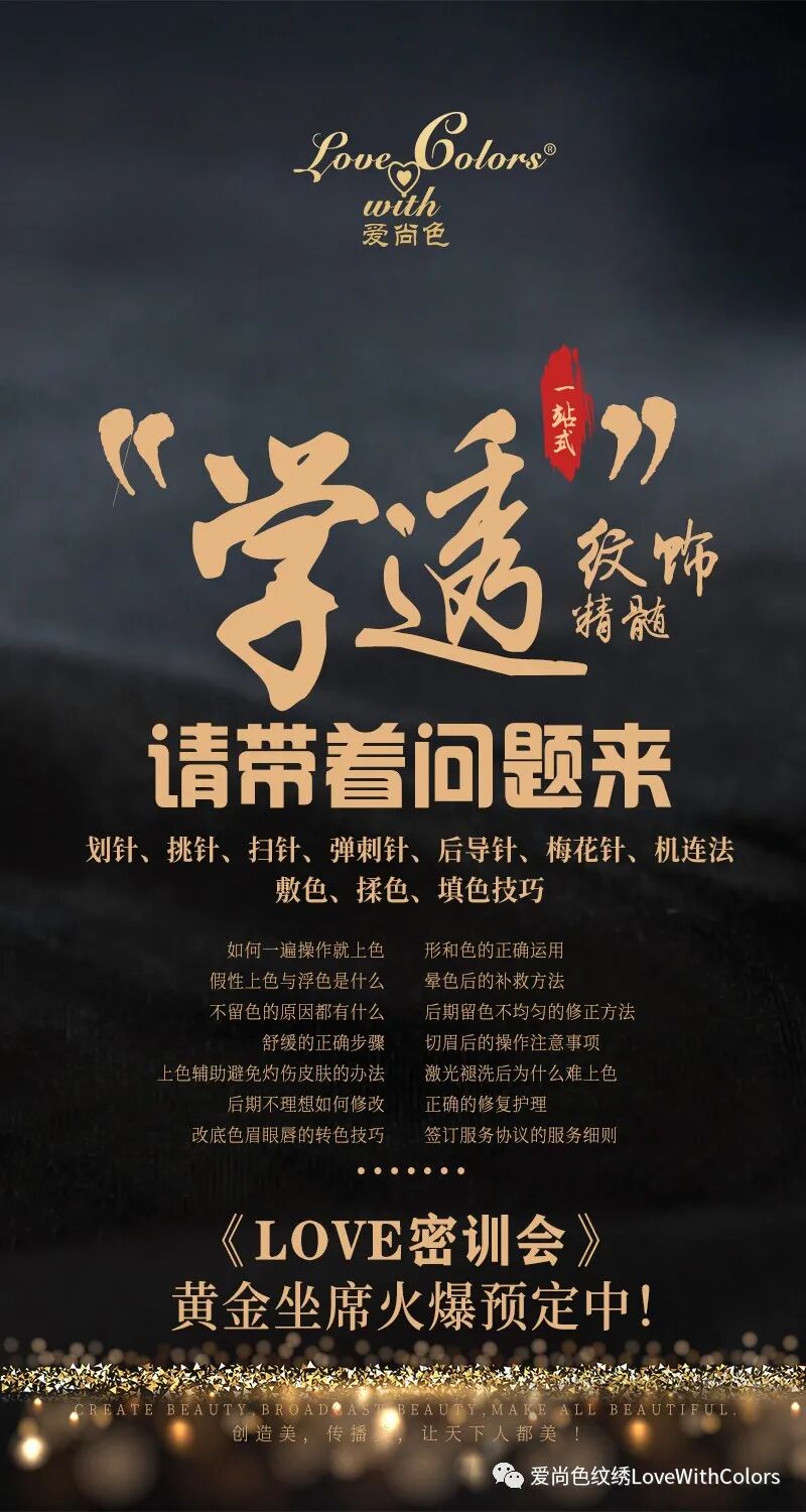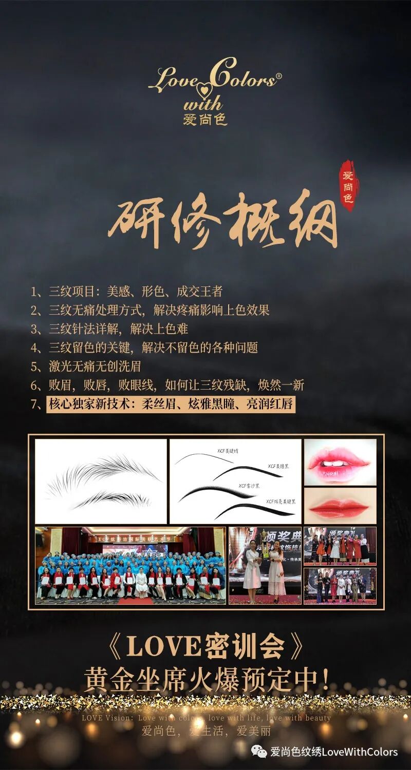 2020年12月28-29日 LOVE年终特训营·山西运城站 深入剖析半永久定妆手法 让您“学透”纹饰精髓 原生播眉全新技术震撼来袭 半永久 x 高科技 从“百”到“千”再到“万” 焕发毛发内在生命力,孕育自然毛发 “差异化”技术,让您与众不同,更具核心竞争力! LOVE国家商标注册认证技术绒妆眉®、媚尚眼线®、爱尚炫唇®,“科学理论+实践技法”当然更胜一筹! LOVE纹绣厂家技术总监王总监,深耕半永久纹绣事业,专业专注钻研纹绣技法,革新半永久纹绣技术,为纹绣行业健康发展贡献力量! LOVE资深教学团队携LOVE山西省技术总监范老师、曲老师,为各位热爱半永久纹绣事业的家人们,分享多年的半永久纹绣实战经验! 全程干货·实战演练 手把手,让您从入门到精通! “差异化”更具核心竞争力! 2020年12月28-29日 LOVE年终特训营·山西运城站 黄金坐席•名额有限•满员即止 关注LOVE公众号:LOVEPMU 发送“姓名+电话+山西运城”即可报名 爱尚色•爱生活•爱美丽报名方式: