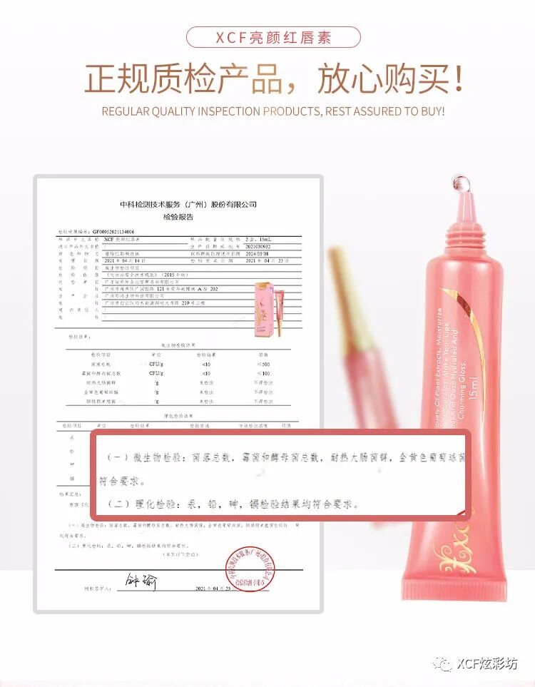 XCF炫彩坊亮颜红唇素已经过正规质检部门质检,并完成国家部门备案认证,正规专业产品!XCF品牌出品,质量有保障,您值得信赖!